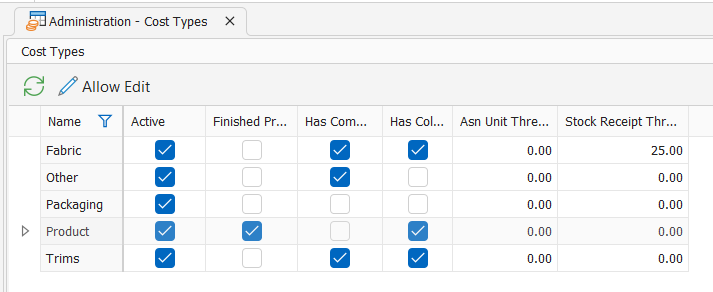 These are the main categories of costs used to build the total cost of a garment. Cost Types group similar cost elements together in your costings & for reporting purposes.