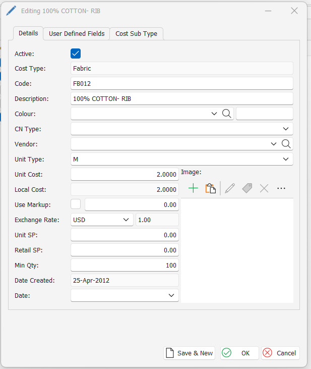 | Cost Type | Specifies the cost type under which this sub type falls | Fabric |