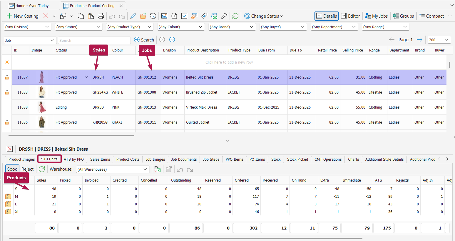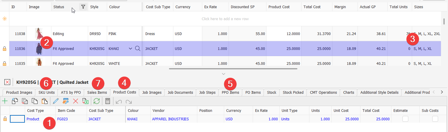 All Styles are 'housed' within a Job. The job then houses the operational execution of producing/ procuring that style in specific quantities, colors, and sizes.