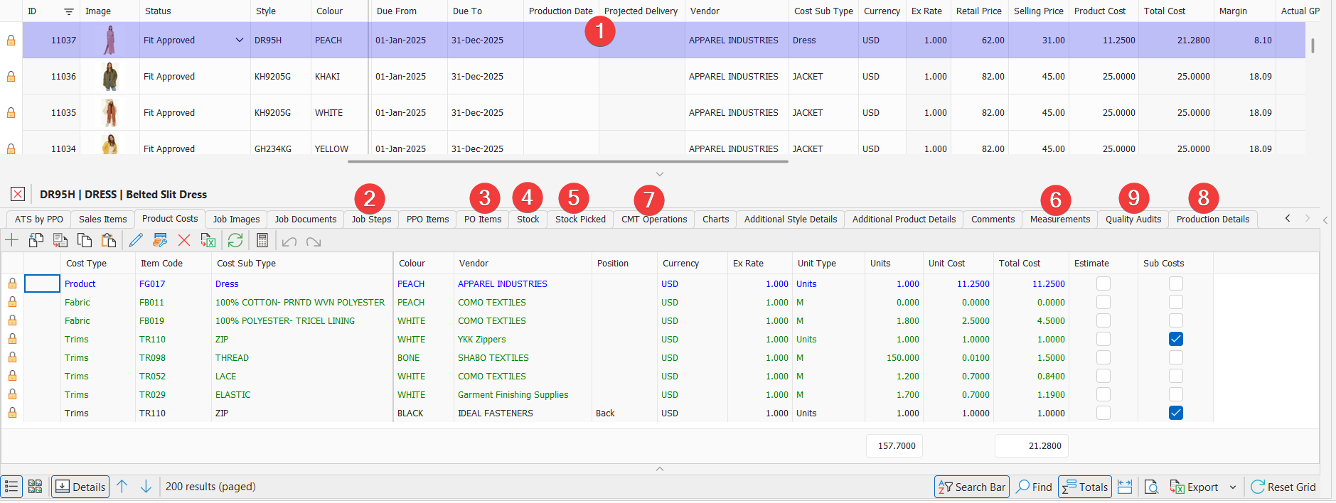 - Purchase Orders (PO's) - Orders for the raw materials required to make up the finished garment